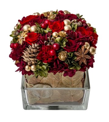 Nicolai Bergmannが海外より買い付けた真っ赤な器にあわせ、赤いバラをメインにドライの実ものやオーナメントをたっぷりあしらったプリザーブドフラワーアレンジメントです。この“メリークリスマス”をご自宅に飾って、素敵なクリスマスをお過ごしください。